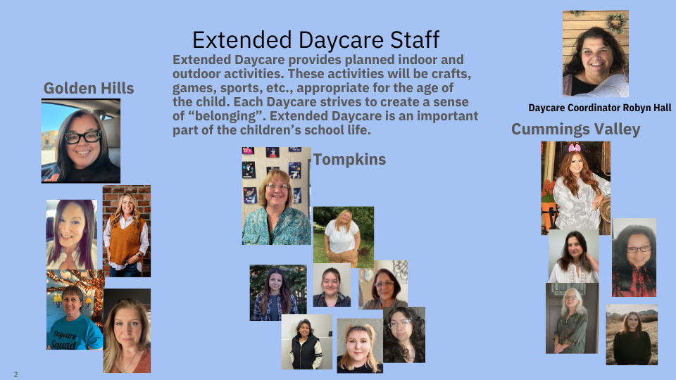 In an effort to address the before and after school needs of parents in the community, the Tehachapi Unified School District provides Extended Daycare services at all of its elementary schools, Golden Hills, Cummings Valley, and Tompkins, and for students Transitional Kindergarten through Fifth Grade