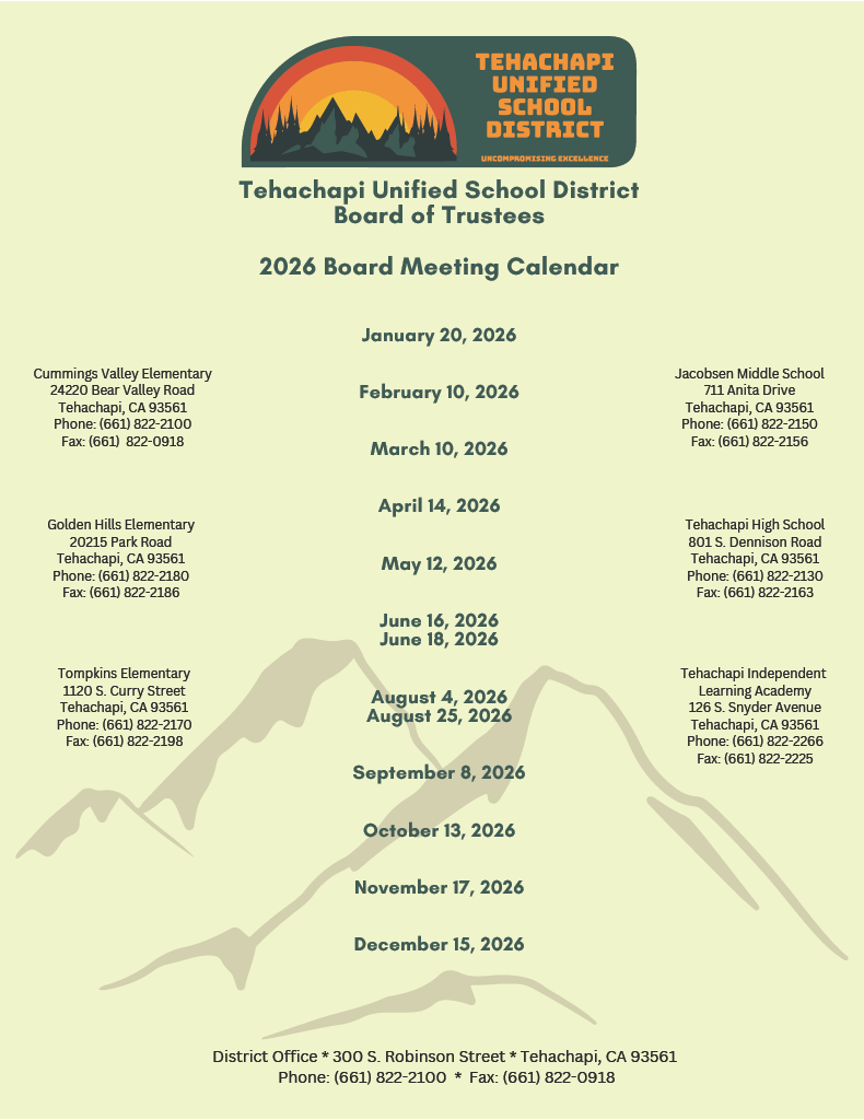 We still need to set our basic strategies and then lay out action plans that specify what is actually to be done, by whom and when. Your thoughts on this process are important and we would love comments and any ideas you have about the District. You can email your thoughts, comments, suggestions and issues to: comments@tehachapiusd.com. This is an evolving process and your input is important. Final statements and plans will take into account everyone’s contributions.